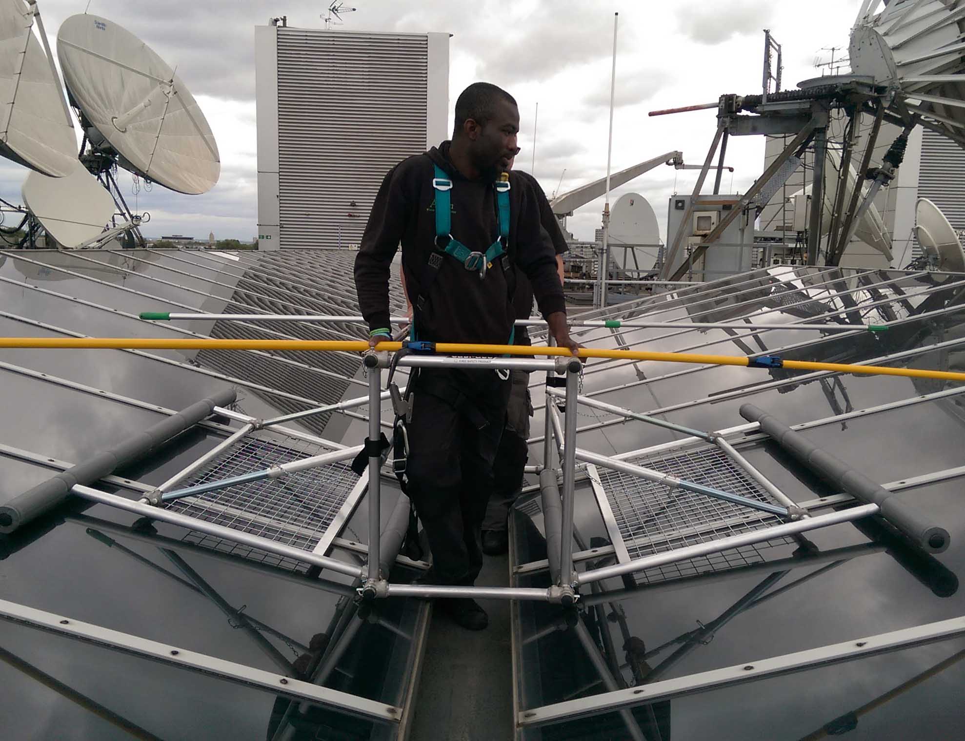 Roof-Walk is a fully guarded rolling work platform mounted on twin tracks to enable you to move up and down the roof. The standard length platform is 4.6m and runs up and down twin modular 4m linking track sections that are fitted with safety mesh and support battens.